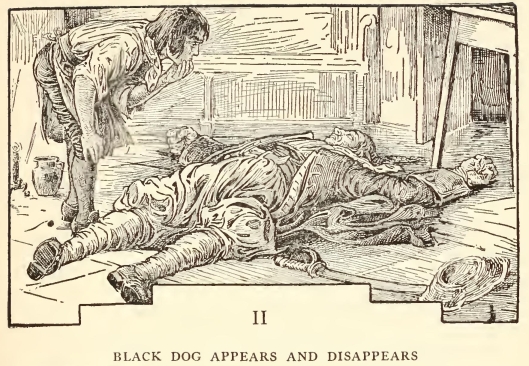 その一撃が戦いの終わりだった。道に出ると、黒犬は傷にもかかわらず、驚くほど見事な足さばきを見せ、半分のうちに丘の向こうへと消えていった。船長はと言えば、呆然とした男のように看板をじっと見つめていた。それから彼は何度か手で目をこすり、ついに家の中へと引き返した。