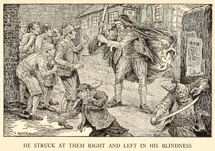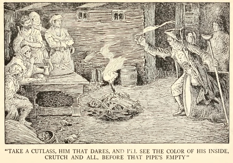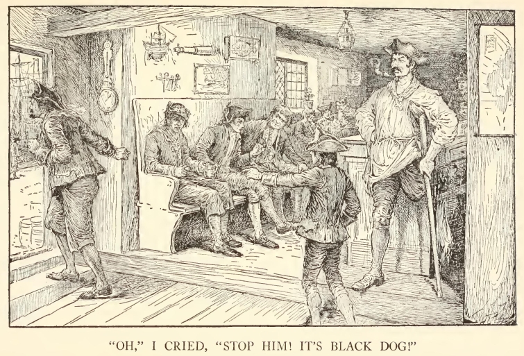 その時、突然、すさまじい悪態と物音の爆発があった。椅子とテーブルが一塊になって倒れ、鋼のぶつかる音が続き、そして苦痛の叫び声。次の瞬間、私は黒犬が全力で逃げ出し、船長が猛然と追いかけるのを見た。二人ともカトラスを抜いており、黒犬は左肩から血を流していた。ちょうど戸口で、船長は逃亡者めがけて最後の一撃を放った。もし我々の大きな「ベンボー提督亭」の看板に阻まれていなければ、間違いなく背骨まで真っ二つになっていただろう。その傷跡は、今でも看板の枠の下側に見ることができる。