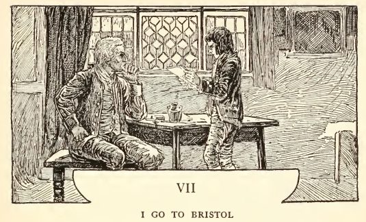 その言葉を口にした時の彼の表情は、決して愉快なものではなく、たとえ彼が本気で言っていたとしても、この見知らぬ男は勘違いしているのだろうと私が考えるだけの理由はあった。しかし、それは私の知ったことではない、と私は思った。それに、どうしていいか分からなかった。見知らぬ男は宿の戸口のすぐ内側をうろつき、鼠を待つ猫のように角から覗き込んでいた。一度、私自身が道に出てみたが、彼はすぐに私を呼び戻した。そして、彼の気にいるほど素早く従わなかったので、その獣脂のような顔が恐ろしく豹変し、私が飛び上がるほどの悪態をついて中に入るよう命じた。私が戻るとすぐに、彼は元の態度に戻り、媚びるようでもあり、嘲るようでもある半々の態度で、私の肩を叩き、私は良い子だ、すっかり気に入ったと言った。「俺にも息子がいてな」と彼は言った。「お前さんと瓜二つで、俺の自慢の種だ。だがな、坊主どもにとって大事なのは規律だ――規律だよ。さて、もしお前さんがビルと一緒に航海していたら、二度も話しかけられるまでそこに突っ立ってはいなかっただろう――お前さんならな。それはビルのやり方じゃなかったし、彼と航海した奴らのやり方でもなかった。おっと、案の定、俺の相棒ビルが来たぞ、腕に望遠鏡を抱えてやがる、まったく、あいつめ。お前さんと俺は、談話室に戻って、ドアの後ろに隠れて、ビルをちょっと驚かせてやろうぜ――まったく、もう一度言ってやる、あいつめ。」