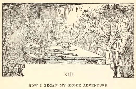 我々はひどい人手不足で、船に乗っている者は皆、手を貸さなければならなかった。ただ船長だけは、船尾のマットレスに横たわって命令を下していた。彼はかなり回復していたが、まだ安静が必要だったのだ。新たな船員なしで本国への航海を危険にさらすことはできなかったので、我々は船首をスペイン領アメリカの最寄りの港に向けた。そして実際のところ、逆風や二度の強風に見舞われ、そこに到着する前に我々は皆、疲れ果ててしまった。 ちょうど日没時に、我々は陸に囲まれたこの上なく美しい湾に錨を下ろした。するとすぐに、黒人やメキシコのインディアン、そして混血の人々でいっぱいの陸からのボートに囲まれ、彼らは果物や野菜を売り、小銭のために海に潜ってみせると申し出た。かくも多くの陽気な顔(特に黒人たちの)、熱帯の果物の味、そして何よりも町に灯り始めた光景は、島での我々の暗く血なまぐさい滞在と、実に魅力的な対照をなしていた。そして博士と郷士は、私を連れて、夜の早い時間を過ごすために上陸した。ここで彼らはイギリスの軍艦の艦長に出会い、彼と語り合い、彼の船に乗り込み、要するに、非常に楽しい時を過ごしたので、我々がヒスパニオラ号の舷側に戻ってきた時には、夜が明け始めていた。