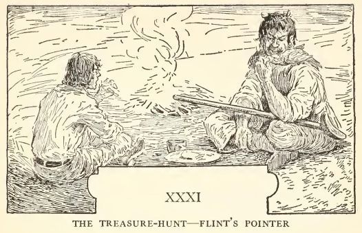 「このおれの石頭にもピンと来たぜ」とシルバーが言った。「ここにコンパスがある。向こうには骸骨島のてっぺんが、歯みたいに突き出してる。そいつを、この骨の線に沿って方位を測ってみてくれ。」 言われた通りにすると、死体はまっすぐ島の方向を指し示しており、コンパスは「東南東よりやや東へ」と正しく読み取れた。