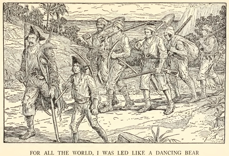 もし誰かが見ていたとしたら、俺たちはさぞかし奇妙な一行に見えたことだろう。全員が薄汚れた船乗りの服をまとい、俺を除いては皆、頭のてっぺんからつま先まで武装していた。シルバーは二丁の銃を体にたすき掛けにし――一丁は前に、もう一丁は後ろに――腰には大きな斬り込み刀を差し、角尾の上着の両ポケットにはピストルを忍ばせていた。その異様な姿をさらに引き立てるように、肩にはフリント船長がとまり、意味のない船乗りの言葉をわけのわからぬ調子でしゃべり散らしている。俺は腰に縄を巻かれ、海のコックの後をおとなしくついていった。彼は縄の端を、ある時は空いている方の手で、またある時はその強靭な歯でくわえていた。どこからどう見ても、俺はまるで芸を仕込まれた熊のように引かれていた。