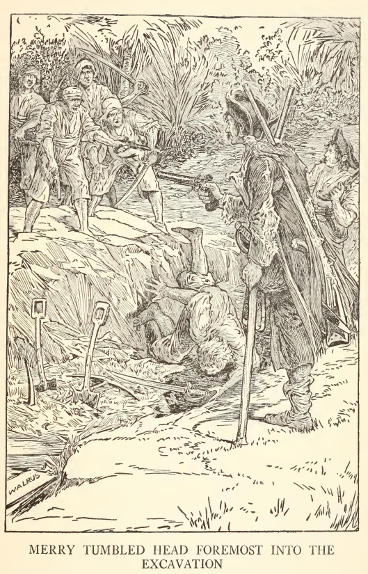 彼が答える時間は残されていなかった。海賊たちは、罵りの言葉と叫び声を上げながら、次々と穴に飛び込み、板を脇に放り投げながら、指で地面を掘り始めた。モーガンが金貨を一枚見つけた。彼はそれを、罵詈雑言の嵐と共に掲げた。それは二ギニー金貨で、十五秒ほどの間、彼らの手から手へと渡された。 「二ギニーだと!」メリーはそれをシルバーに向かって振りながら吼えた。「これがてめえの七十万ポンドか? おめえは取引上手だな、ええ? 何一つしくじったことのねえ男様だよ、この木偶の坊が!」