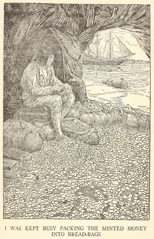 かくして、作業はてきぱきと進められた。グレイとベン・ガンがボートで往復し、その間、残りの者たちは宝を浜辺に積み上げた。金の延べ棒二本を縄の端で吊るすと、大人の男一人分の良い荷物になった。ゆっくりと歩くのが嬉しくなるほどの重さだ。俺はと言えば、運搬にはあまり役に立たなかったので、一日中洞窟で鋳造貨幣を乾パン袋に詰める作業に追われた。