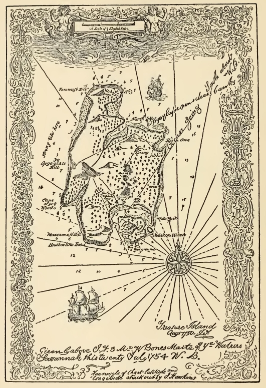 「このおれの石頭にもピンと来たぜ」とシルバーが言った。「ここにコンパスがある。向こうには骸骨島のてっぺんが、歯みたいに突き出してる。そいつを、この骨の線に沿って方位を測ってみてくれ。」 言われた通りにすると、死体はまっすぐ島の方向を指し示しており、コンパスは「東南東よりやや東へ」と正しく読み取れた。