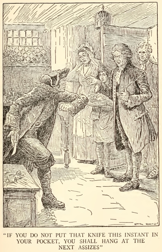 博士は微動だにしなかった。彼は以前と同じように、肩越しに、同じ声の調子で、部屋中の皆に聞こえるようにやや高い声で、しかし完璧に落ち着き払って、彼に話しかけた。「そのナイフを今すぐポケットにしまわないなら、我が名誉にかけて約束しよう。君は次の巡回裁判で絞首刑になる。」