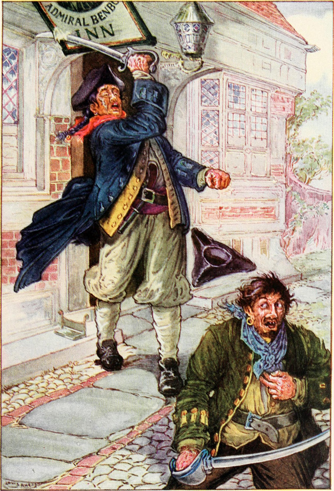 その時、突然、すさまじい悪態と物音の爆発があった。椅子とテーブルが一塊になって倒れ、鋼のぶつかる音が続き、そして苦痛の叫び声。次の瞬間、私は黒犬が全力で逃げ出し、船長が猛然と追いかけるのを見た。二人ともカトラスを抜いており、黒犬は左肩から血を流していた。ちょうど戸口で、船長は逃亡者めがけて最後の一撃を放った。もし我々の大きな「ベンボー提督亭」の看板に阻まれていなければ、間違いなく背骨まで真っ二つになっていただろう。その傷跡は、今でも看板の枠の下側に見ることができる。