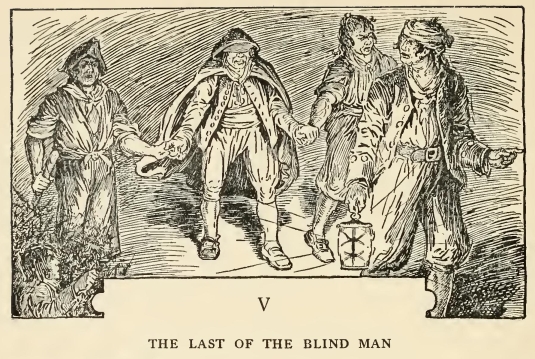 その一撃が戦いの終わりだった。道に出ると、黒犬は傷にもかかわらず、驚くほど見事な足さばきを見せ、半分のうちに丘の向こうへと消えていった。船長はと言えば、呆然とした男のように看板をじっと見つめていた。それから彼は何度か手で目をこすり、ついに家の中へと引き返した。