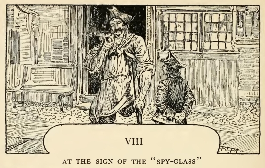 その言葉を口にした時の彼の表情は、決して愉快なものではなく、たとえ彼が本気で言っていたとしても、この見知らぬ男は勘違いしているのだろうと私が考えるだけの理由はあった。しかし、それは私の知ったことではない、と私は思った。それに、どうしていいか分からなかった。見知らぬ男は宿の戸口のすぐ内側をうろつき、鼠を待つ猫のように角から覗き込んでいた。一度、私自身が道に出てみたが、彼はすぐに私を呼び戻した。そして、彼の気にいるほど素早く従わなかったので、その獣脂のような顔が恐ろしく豹変し、私が飛び上がるほどの悪態をついて中に入るよう命じた。私が戻るとすぐに、彼は元の態度に戻り、媚びるようでもあり、嘲るようでもある半々の態度で、私の肩を叩き、私は良い子だ、すっかり気に入ったと言った。「俺にも息子がいてな」と彼は言った。「お前さんと瓜二つで、俺の自慢の種だ。だがな、坊主どもにとって大事なのは規律だ――規律だよ。さて、もしお前さんがビルと一緒に航海していたら、二度も話しかけられるまでそこに突っ立ってはいなかっただろう――お前さんならな。それはビルのやり方じゃなかったし、彼と航海した奴らのやり方でもなかった。おっと、案の定、俺の相棒ビルが来たぞ、腕に望遠鏡を抱えてやがる、まったく、あいつめ。お前さんと俺は、談話室に戻って、ドアの後ろに隠れて、ビルをちょっと驚かせてやろうぜ――まったく、もう一度言ってやる、あいつめ。」