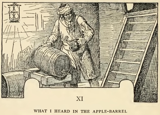 一月のある朝、非常に早い時間だった。身を切るような、霜の降りる朝で、入り江は白霜で一面灰色になり、さざ波が静かに石に打ち寄せ、太陽はまだ低く、丘の頂を照らし、はるか沖まで輝いているだけだった。船長はいつもより早く起き、浜辺へと下りていった。古い青い上着の広い裾の下でカトラスを揺らし、真鍮の望遠鏡を脇に抱え、帽子を後ろに傾けていた。彼が闊歩していくと、その吐く息が煙のように後に残り、大きな岩を曲がる彼から聞こえた最後の音は、まるでまだライブシー博士のことで頭がいっぱいであるかのような、憤慨した大きな鼻息だったのを覚えている。