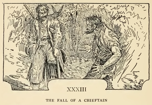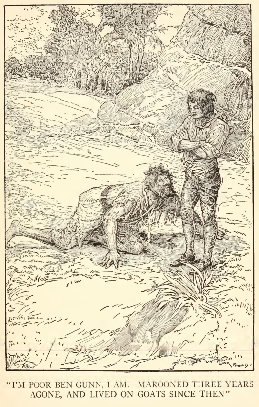 その朝、私が反乱者たちのために用意された恐ろしい失望に巻き込まれることを知ると、彼は洞窟まで走り、郷士に船長の護衛を任せ、グレイと置き去りの男を連れて出発し、松の木のそばで待ち受けるべく島を斜めに横切ってきたのだ。しかし、すぐに我々のパーティーの方が先に出発したことに気づき、足の速いベン・ガンを先に送り出し、一人でできるだけのことをやらせた。その時、ベン・ガンはかつての船仲間たちの迷信深さを利用することを思いついた。そして、それは大いに成功し、グレイと博士が追いついて、宝探しの連中が到着する前にすでに待ち伏せを完了することができたというわけだ。