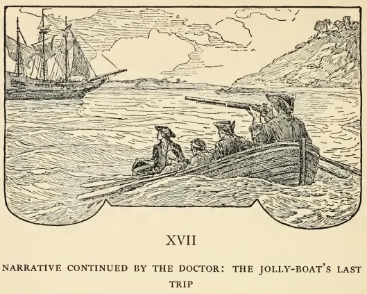 この時までに、俺たちはギグボートにたどり着いていた。博士はつるはしでそのうちの一艘を破壊し、それから俺たちは全員でもう一艘に乗り込み、海路で北の入り江を目指して出発した。 八、九マイルの道のりだった。シルバーは、すでに疲労で死にそうだったが、俺たちと同じようにオールを漕がされ、俺たちはすぐに穏やかな海上を滑るように進んだ。まもなく俺たちは海峡を抜け、島の南東の角を回った。四日前、俺たちがヒスパニオラ号を曳航した場所だ。