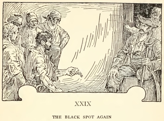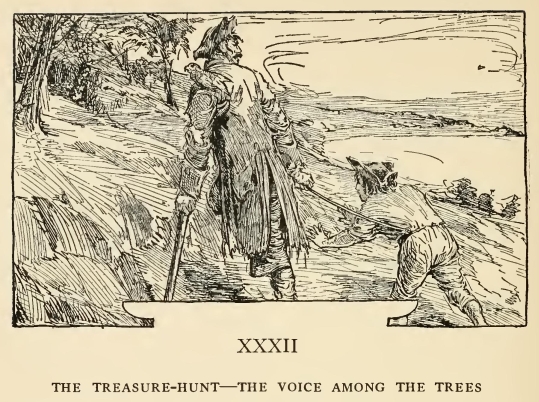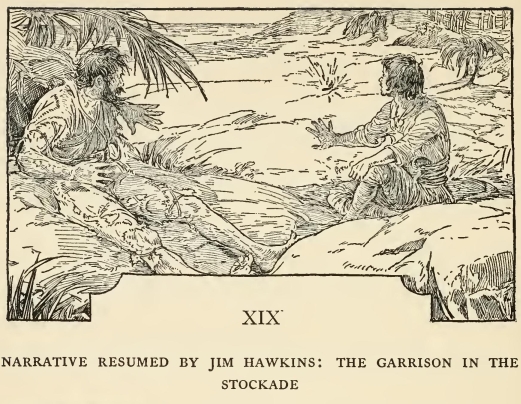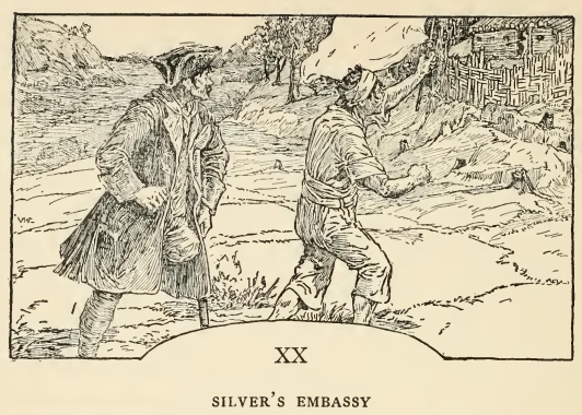 「ジム」と、二人きりになるとシルバーは言った。「俺がおめえの命を救ったなら、おめえは俺の命を救った。その恩は忘れねえ。博士がおめえに逃げろと手招きしてるのを、この目で見た。そしておめえが断るのも、はっきりと聞こえるようだったぜ。ジム、こいつはおめえに一本取られたな。襲撃が失敗してから初めて見えた一筋の希望だ。これもみんなおめえのおかげだ。そして今、ジム、俺たちはこれから宝探しに出かけるわけだが、封印命令付きと来たもんだ。こいつは気に入らねえ。おめえと俺は、背中合わせでぴったりくっついてなきゃならねえ。そして、運命や幸運なんかに逆らってでも、俺たちの首を守り抜くんだ。」