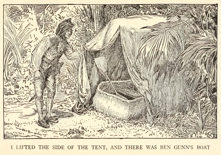 博士はグレイを、反乱者たちが逃げる際に置き去りにしたつるはしの一つを取りに戻らせた。そして、ボートが置いてある場所へとゆっくり丘を下りながら、事の顛末をかいつまんで話してくれた。それはシルバーを大いに引きつける話だった。そして、半ば白痴の置き去りにされた男、ベン・ガンが、始めから終わりまでの英雄だった。 ベンは、島での長く孤独な放浪の間に、あの骸骨を見つけ――その所持品を漁ったのは彼だった――、宝を見つけ、掘り出した(穴の中に折れて落ちていたのは、彼のつるはしの柄だった)。そして、何度も骨の折れる旅を重ねて、その宝を背負って高い松の木の根元から、島の北東の角にある二つの尖った丘の洞窟まで運び、ヒスパニオラ号が到着する二ヶ月も前から、そこに安全に保管していたのだ。
