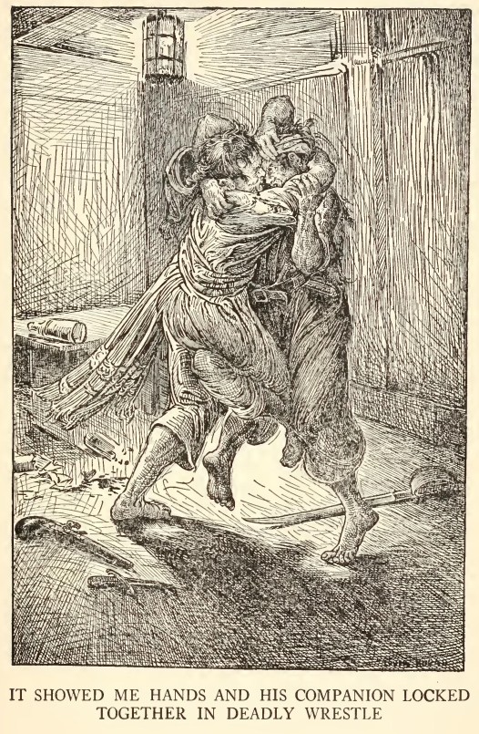 そう言うと、見知らぬ男は私と一緒に談話室へと後ずさり、私を自分の後ろの隅に押しやったので、我々は二人とも開いたドアに隠れる形になった。ご想像の通り、私は非常に不安で怯えていたが、見知らぬ男自身も明らかに怖がっている様子を見て、恐怖はさらに増した。彼はカトラスの柄を握りやすいようにし、鞘の中で刃を緩めた。そして、我々が待っている間ずっと、喉に塊が詰まったような感じで唾を飲み込み続けていた。
