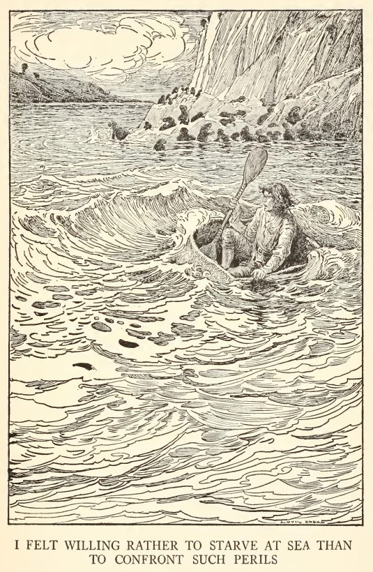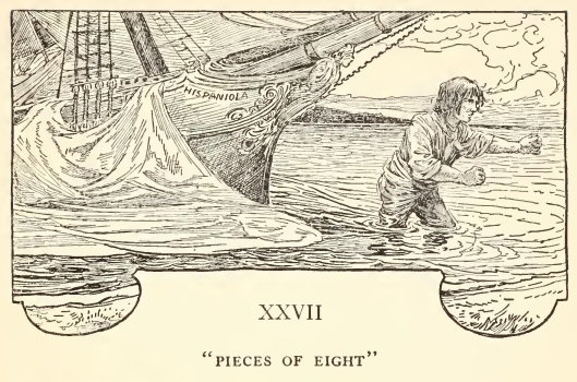 我々はひどい人手不足で、船に乗っている者は皆、手を貸さなければならなかった。ただ船長だけは、船尾のマットレスに横たわって命令を下していた。彼はかなり回復していたが、まだ安静が必要だったのだ。新たな船員なしで本国への航海を危険にさらすことはできなかったので、我々は船首をスペイン領アメリカの最寄りの港に向けた。そして実際のところ、逆風や二度の強風に見舞われ、そこに到着する前に我々は皆、疲れ果ててしまった。 ちょうど日没時に、我々は陸に囲まれたこの上なく美しい湾に錨を下ろした。するとすぐに、黒人やメキシコのインディアン、そして混血の人々でいっぱいの陸からのボートに囲まれ、彼らは果物や野菜を売り、小銭のために海に潜ってみせると申し出た。かくも多くの陽気な顔(特に黒人たちの)、熱帯の果物の味、そして何よりも町に灯り始めた光景は、島での我々の暗く血なまぐさい滞在と、実に魅力的な対照をなしていた。そして博士と郷士は、私を連れて、夜の早い時間を過ごすために上陸した。ここで彼らはイギリスの軍艦の艦長に出会い、彼と語り合い、彼の船に乗り込み、要するに、非常に楽しい時を過ごしたので、我々がヒスパニオラ号の舷側に戻ってきた時には、夜が明け始めていた。