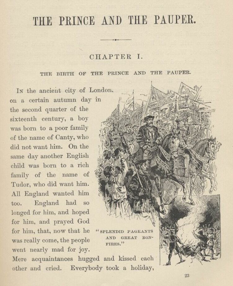 いにしえの都ロンドンで、十六世紀第二四半期のある秋の日、キャンティという名の貧しい一家に、望まれもしない男の子が生まれた。同じ日、もう一人のイングランドの子が、チューダーという名の裕福な一家に生まれた。こちらは望まれた子であった。イングランド中が彼を望んでいた。イングランドがどれほど彼を待ち焦がれ、望みをかけ、神に祈りを捧げてきたことか。ついに彼が生まれた今、人々は喜びのあまり狂喜乱舞した。ただの知り合い同士が抱き合い、口づけを交わし、涙を流した。誰もが仕事を休み、身分の高い者も低い者も、富める者も貧しい者も、ご馳走を囲み、踊り、歌い、陽気に酔いしれた。そして、そのお祭り騒ぎは昼も夜も何日も続いた。昼のロンドンは壮観だった。あらゆるバルコニーや屋根の上で色鮮やかな旗がはためき、華麗な祝賀行列が練り歩いた。夜もまた壮観だった。辻々では巨大な篝火が燃え盛り、その周りでは陽気な人々が群れをなして騒いでいた。イングランド中の話題は、ただ一人、生まれたばかりの赤子のことばかりだった。その子の名はエドワード・チューダー、プリンス・オブ・ウェールズ。絹と繻子にくるまれ、この大騒ぎを知る由もなく、高貴な紳士淑女たちが傅き、見守っていることなど気にもかけずに眠っていた――いや、気にもしていなかった。しかし、もう一人の赤子、トム・キャンティについては誰も語らなかった。みすぼらしいぼろ切れにくるまれたその子は、その誕生によってただでさえ苦しい生活をさらに厄介なものにされた乞食一家の間でしか、話題に上ることはなかった。