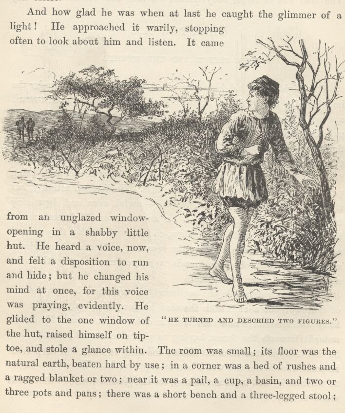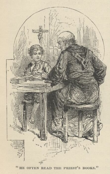 彼はしばしば神父の古い本を読み、説明を求め、話を膨らませてもらった。夢想と読書は、やがて彼の中にいくつかの変化をもたらした。彼の夢の中の人々はあまりに素晴らしかったので、彼は自分のみすぼらしい服と汚さを嘆き、清潔になり、もっと良い服を着たいと願うようになった。彼は相変わらず泥んこになって遊び、それを楽しんでもいた。しかし、ただ面白いからというだけでテムズ川で水しぶきを上げる代わりに、川の水がもたらす洗い清めるという付加価値を見出し始めた。