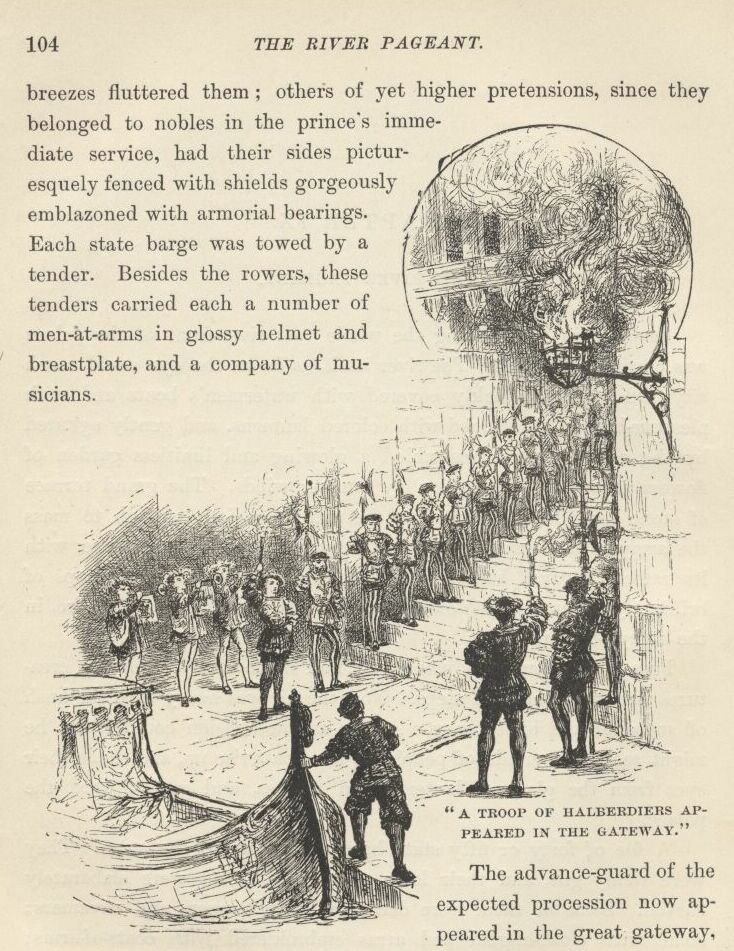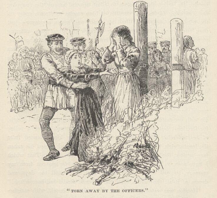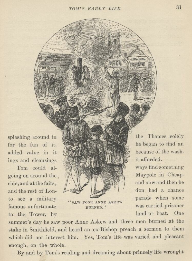 トムは、チープサイドの五月祭の柱[訳注: メイポール。五月祭で花やリボンで飾られる柱]の周りや、市が立つ場所では、いつも何か面白いことを見つけることができた。そして時折、彼や他のロンドン市民は、高名な罪人が陸路か水路でロンドン塔へ護送される際の軍事パレードを見る機会があった。ある夏の日、彼はスミスフィールドで哀れなアン・アスキューと三人の男が火刑に処されるのを目撃し、元司教が彼らに向けて行う説教を聞いたが、興味は湧かなかった。そう、トムの人生は、総じて変化に富み、十分に楽しいものだった。