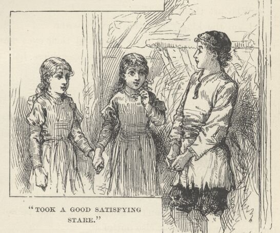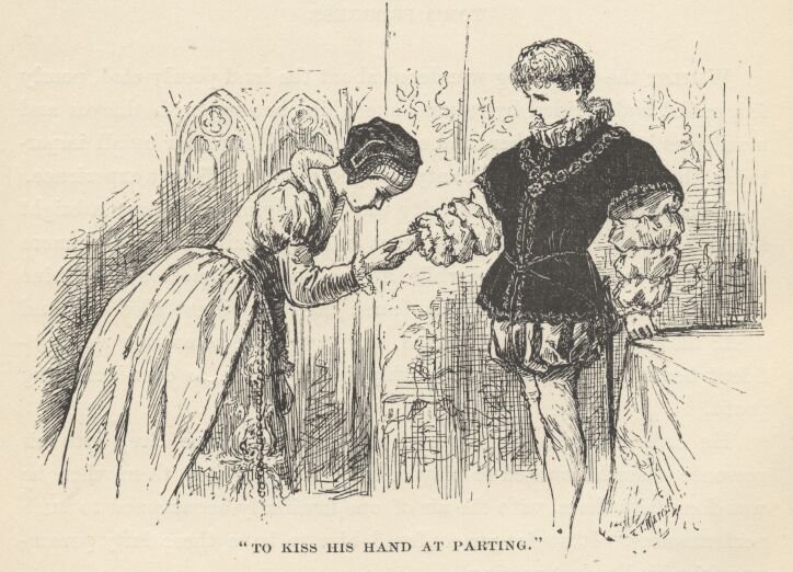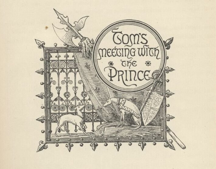 哀れな小さなトムは、ぼろをまとい、高鳴る胸と膨らむ希望を抱いて、ゆっくりとおずおずと衛兵のそばを通り過ぎようとしていた。その時、ふと金色の格子の向こうに、喜びのあまり叫び出しそうになる光景を目にした。中にいたのは、頑健な戸外でのスポーツや運動で日に焼けた、美しい少年だった。彼の衣服はすべて愛らしい絹と繻子でできており、宝石で輝いていた。腰には宝石をちりばめた小さな剣と短剣を帯び、足には赤い踵の優美な半長靴を履き、頭には大きな輝く宝石で留められた羽飾りの垂れた、粋な深紅色の帽子をかぶっていた。近くには数人の豪華な紳士が立っていた――間違いなく彼の従者だろう。おお! 彼は王子だ――王子、生きている王子、本物の王子だ――疑いの影すらなかった。そして、乞食の少年の心の祈りは、ついに聞き届けられたのだ。