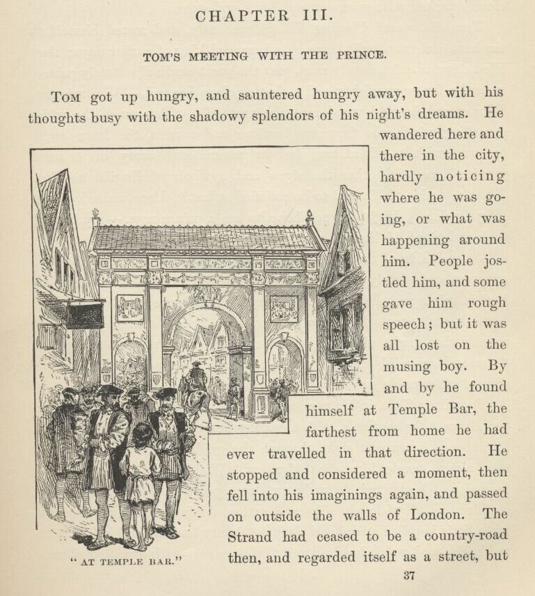トムは空腹のまま起き上がり、空腹のままぶらぶらと出かけたが、頭の中は夜に見た夢の幻の栄華でいっぱいだった。彼は街をあちこちさまよい、自分がどこへ向かっているのか、周りで何が起こっているのか、ほとんど気づかなかった。人々が彼を突き飛ばし、中には乱暴な言葉を浴びせる者もいたが、物思いにふける少年には何も聞こえなかった。やがて彼はテンプル・バーにいることに気づいた。その方角では、家から最も遠くまで来た場所だった。彼は立ち止まって一瞬考えたが、再び空想にふけり、ロンドンの城壁の外へと進んだ。その頃、ストランドはもはや田舎道ではなく、通りと見なされていたが、それは無理のある解釈だった。というのも、片側にはまあまあ密集した家並みがあったものの、もう一方にはいくつかの大きな建物が点在しているだけで、それらは裕福な貴族の宮殿であり、川まで広がる広大で美しい庭園を持っていたからだ――その庭園は今では、無機質なレンガと石の建物が何エーカーにもわたってひしめき合っている。