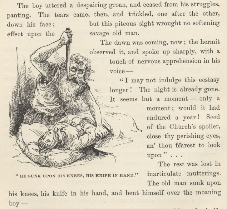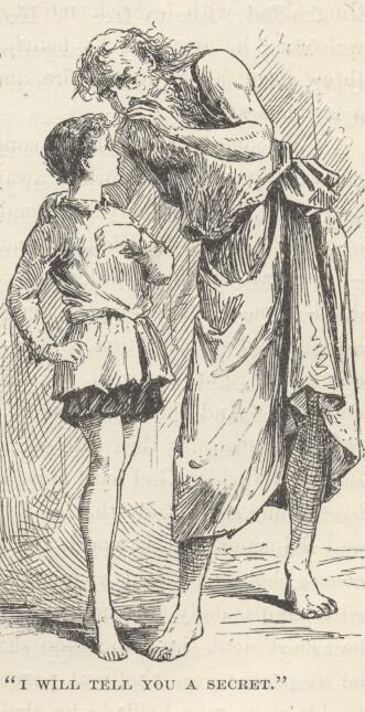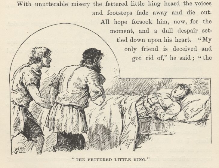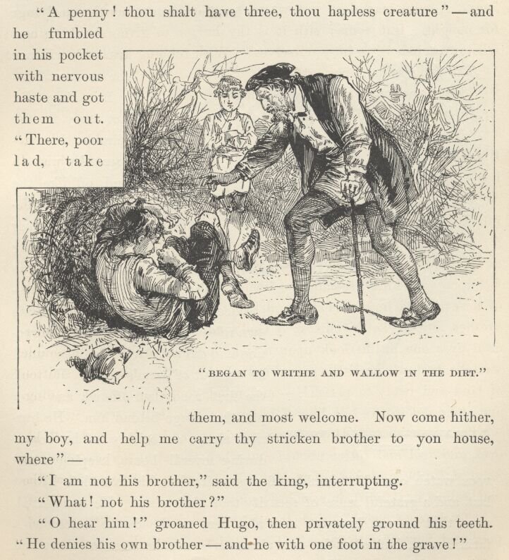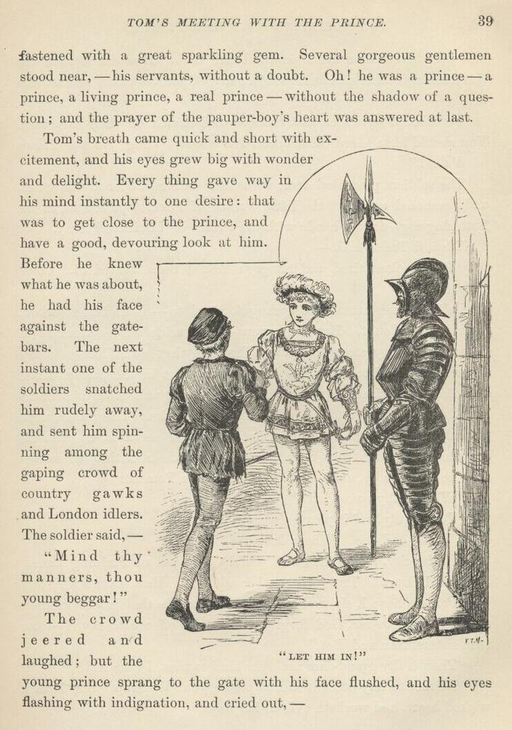 いや、トムの生活は、特に夏の間は、まずまず順調だった。物乞いに対する法律は厳しく、罰則も重かったため、彼はただ罰を免れる程度にしか物乞いをしなかった。だから、時間の多くは、善良なアンドリュー神父が語ってくれる、巨人や妖精、小人や精霊、魔法の城、そして豪華絢爛な王や王子たちの魅力的な古い物語や伝説に耳を傾けて過ごした。彼の頭はこうした素晴らしい物語でいっぱいになった。鞭打たれて痛み、疲れ、腹を空かせ、乏しく悪臭を放つ藁の上に暗闇で横たわる多くの夜、彼は想像力の翼を広げ、王宮で寵愛される王子の魔法のような生活を心に甘美に描き出すうちに、すぐに痛みや苦しみを忘れた。やがて一つの願望が昼も夜も彼を悩ませるようになった。それは、本物の王子を、この目で一度見てみたいというものだった。一度、臓物横丁の仲間たちにそのことを話してみたが、彼らは無慈悲なまでに彼を嘲り、馬鹿にしたので、それ以降、彼はその夢を胸の内に秘めておくことにした。