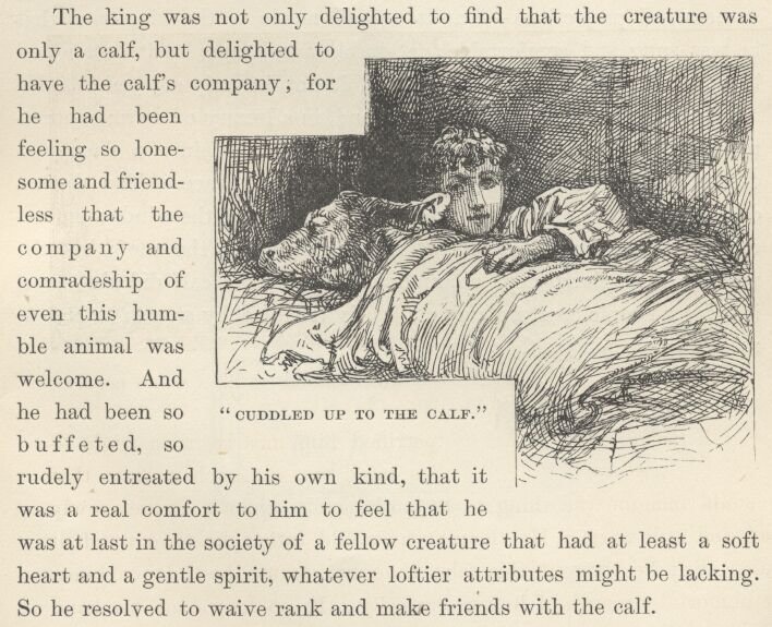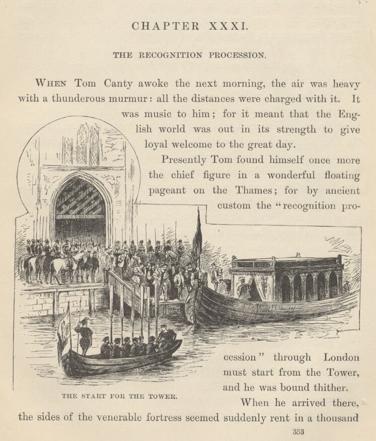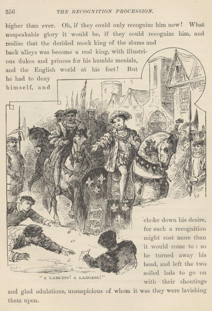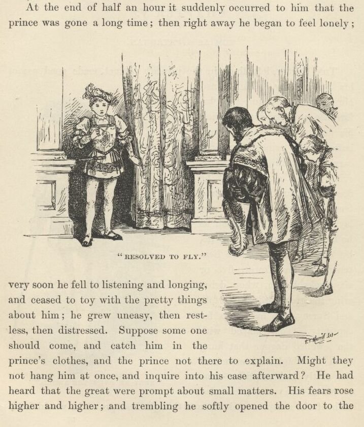彼は再び王を見つめ、思った。「これは夢なのか……それとも、彼こそが正真正銘のイングランド国王で、俺が思い込んでいたような、友もなき精神病院帰りのトムではないのか――誰がこの謎を解いてくれるというのだ?」