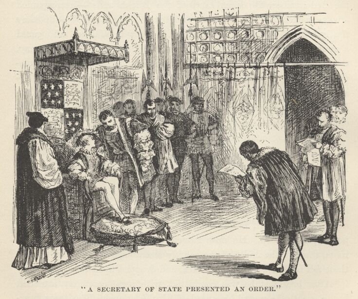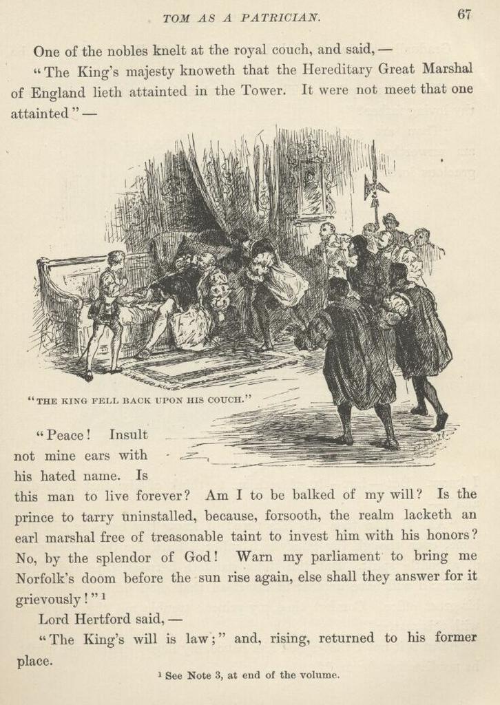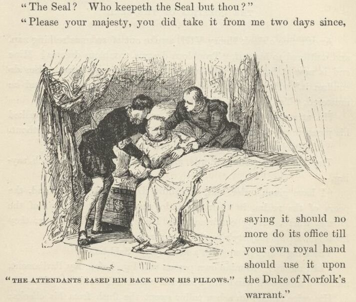 王は今や死期が迫っており、ノーフォーク公を取り逃がすことを恐れ、庶民院に伝言を送った。それによって、ノーフォーク公が式部卿の地位を享受しており、息子のウェールズ公の叙任式で職務を遂行する別の者を任命する必要があるという口実のもと、法案を急ぐよう求めた。――ヒューム著『イングランド史』第3巻、307ページ。