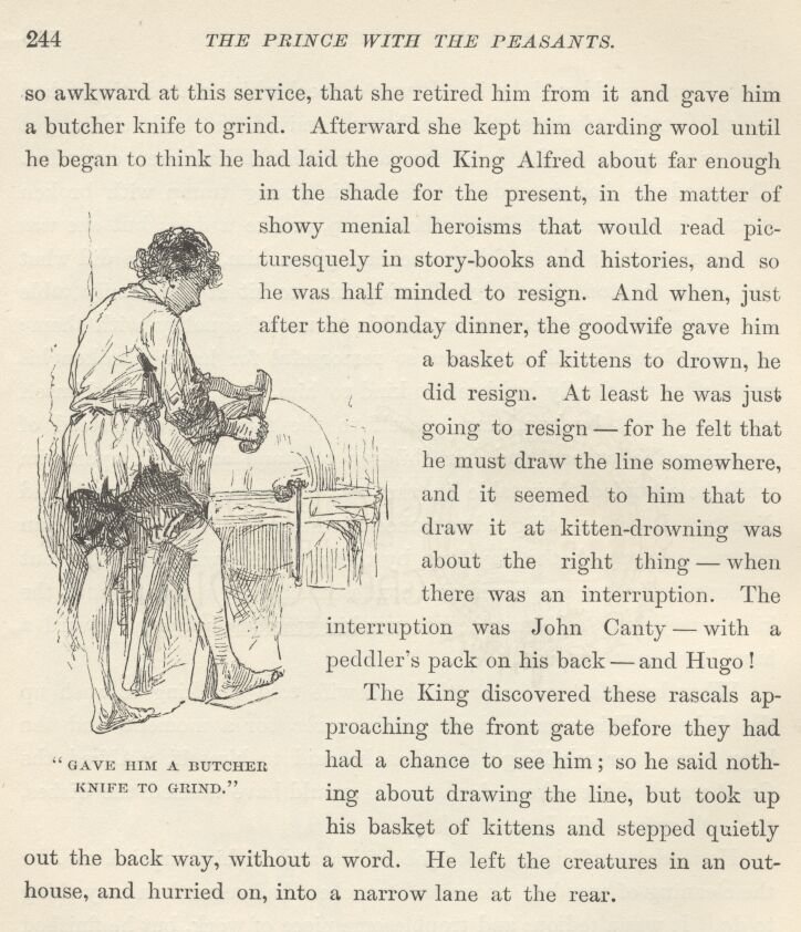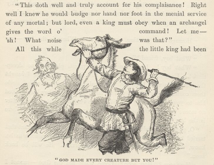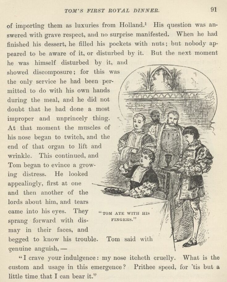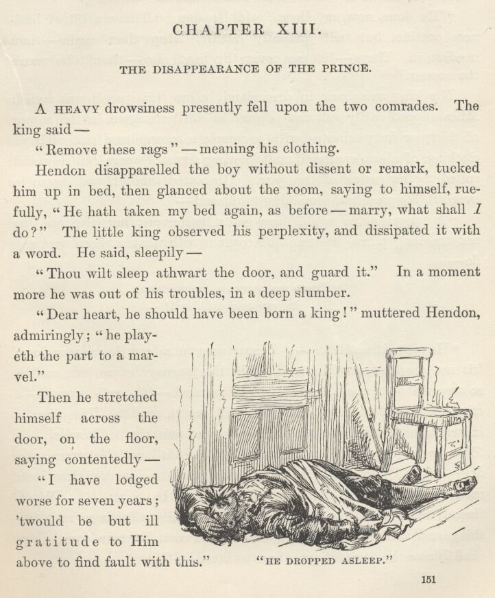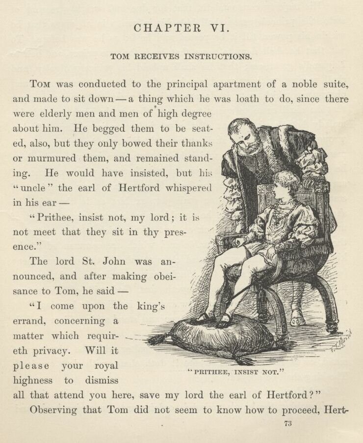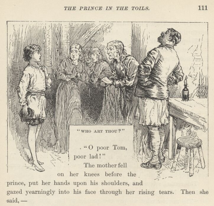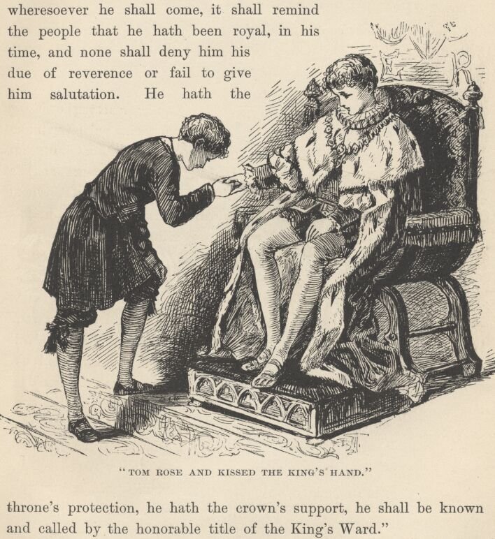 やがて、トムの読書と王子のような生活への夢想は、彼に強い影響を及ぼし、彼は無意識のうちに王子のように 振る舞う ようになった。彼の話し方や物腰は、奇妙なほど儀式ばり、宮廷風になり、親しい仲間たちを大いに感心させ、楽しませた。しかし、トムの仲間内での影響力は日増しに大きくなり、やがて彼は、一種の驚きと畏敬の念をもって、優れた存在として仰ぎ見られるようになった。彼はなんと物知りなのだろう! なんと素晴らしいことをし、言うのだろう! そして何よりも、なんと思慮深く賢いのだろう! トムの言葉や振る舞いは、少年たちによって彼らの年長者に報告された。そして、年長者たちもまた、やがてトム・キャンティについて語り始め、彼を非常に才能のある非凡な存在と見なすようになった。大人たちまでもが、自分たちの悩みをトムに持ち込んで解決を求め、彼の判断の機知と賢明さにしばしば驚かされた。事実、彼は自分の家族を除いて、彼を知るすべての人々にとって英雄となっていた――ただ家族だけが、彼の中に何も見出さなかった。