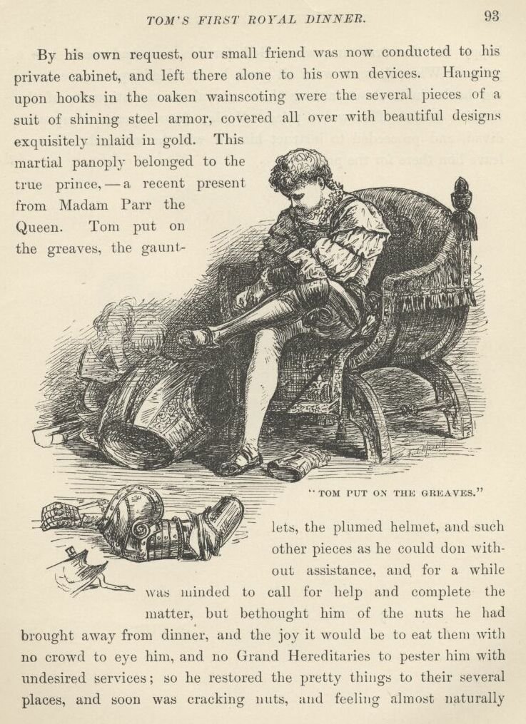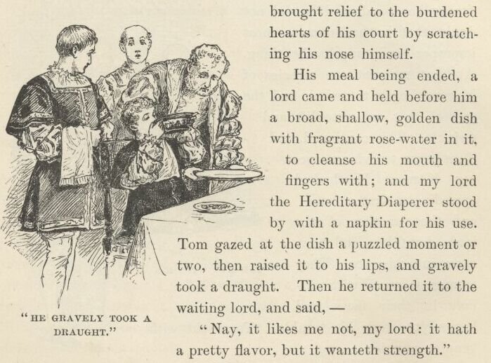 しばらくして、トムは内密に宮廷ごっこを組織した! 彼が王子であり、彼の特別な仲間たちは護衛、侍従、馬丁、侍従の貴族や貴婦人、そして王室の一員となった。毎日、偽りの王子は、トムがロマンチックな物語から借用した手の込んだ儀式で迎えられた。毎日、模擬王国の重大な国事が王室会議で議論され、毎日、偽りの王子殿下は、彼の想像上の陸軍、海軍、そして副王領に布告を発した。