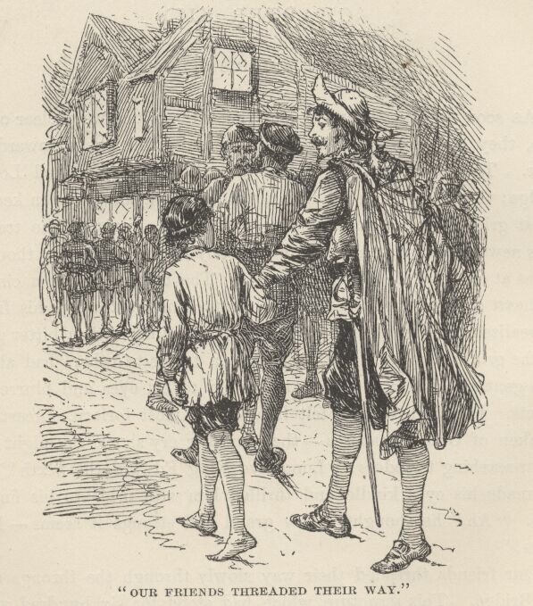 彼はすぐに、走ったり、跳んだり、ボール遊びや馬跳びをしたり、その他にも騒々しく遊び戯れている少年たちの群れの中にいた。彼らは皆同じ服を着ており、それは当時、召使いや徒弟の間で流行していた様式だった――すなわち、それぞれの頭頂部には受け皿ほどの大きさの平たい黒い帽子をかぶっていたが、あまりに小さいため覆いとしての役には立たず、装飾的でもなかった。その下からは、分け目のない髪が額の中ほどまで垂れ、周りをまっすぐに切りそろえられていた。首には聖職者風の襟飾り、体にぴったり合った青いガウンは膝かそれより下まで届き、袖はゆったりとしていた。幅広の赤いベルトを締め、膝の上で留めた鮮やかな黄色の靴下を履き、大きな金属のバックルが付いた浅沓を履いていた。それは、なかなかに醜い服装であった。