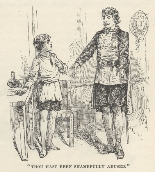トムを虐待した兵士は即座に従った。そして、王子が王家の怒りに半ば窒息しながら門を突き破って出ると、兵士は彼の耳に強烈な平手打ちを食らわせ、彼を道に吹き飛ばして言った。