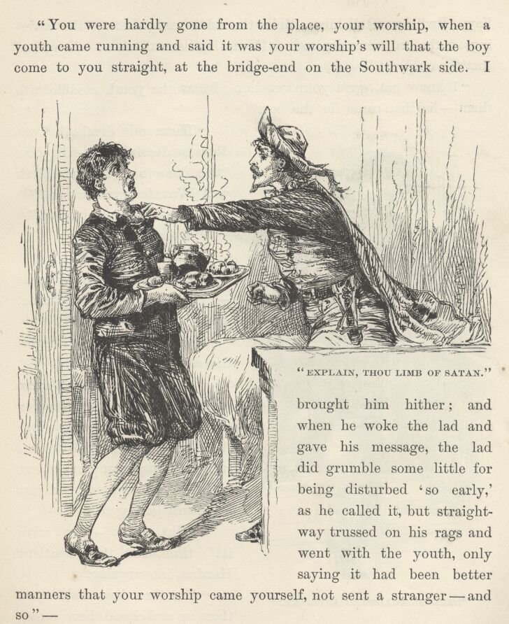 「学ぶがよい、少年よ。難しいのは最初だけだ。ギリシャ語はもっと難しい。しかし、これらも他のどの言語も、エリザベス王女や我が従姉妹にとっては難しくはないと思う。あの娘たちの語学を聞かせてやりたいものだ! だが、そなたの臓物横丁について話してくれ。そこでの生活は楽しいか?」