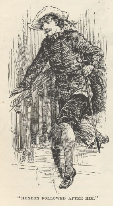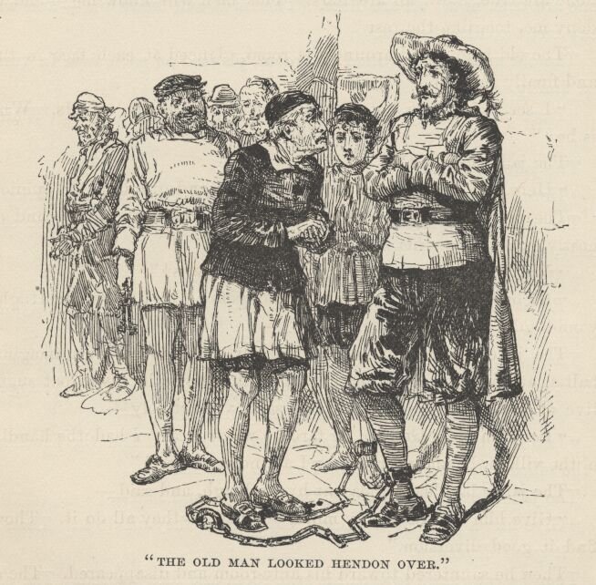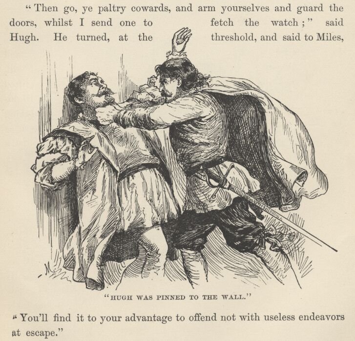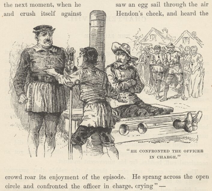ヘンドンは示された場所――宮殿の壁に設けられた窪みで、石のベンチが備え付けられている、悪天候の際の歩哨の避難所――へと下がった。彼が腰を下ろすか下ろさないかのうちに、士官に率いられた数人の矛槍兵が通りかかった。士官は彼を見つけると部下を停止させ、ヘンドンに出てくるよう命じた。彼はそれに従い、宮殿の敷地内をうろつく不審人物として、即座に逮捕された。事態は険悪な様相を呈し始めた。哀れなマイルズは説明しようとしたが、士官は荒々しく彼を黙らせ、部下に武器を取り上げ、身体を改めるよう命じた。