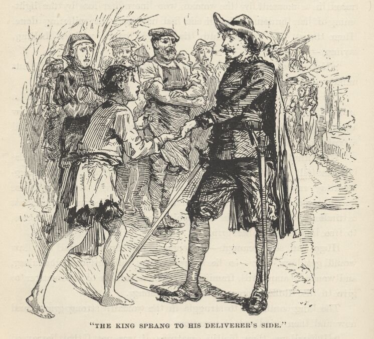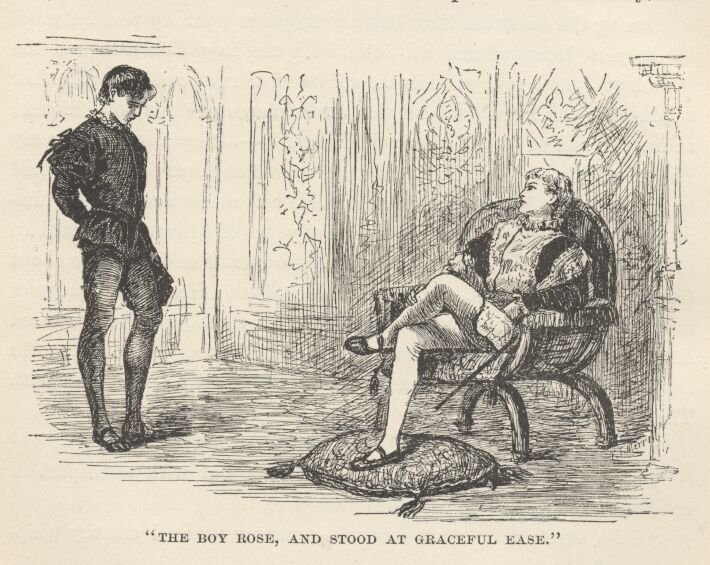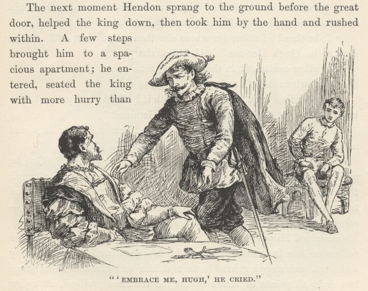 マイルズ・ヘンドンは完全に当惑していた。五歩先には、天蓋付きの玉座に若き王が座り、頭を傾けて、人間離れした極楽鳥のような人物――おそらくは公爵だろう――と話していた。ヘンドンは、人生の盛りに死刑を宣告されるだけでも十分に辛いのに、こんな風に人前で屈辱を加えられるとは、と独りごちた。王にはさっさと事を済ませてほしいものだ――近くにいるけばけばしい連中が、かなり不愉快になってきた。その瞬間、王がわずかに顔を上げ、ヘンドンはその顔をはっきりと見ることができた。その光景に、彼は息を呑んだ! ――彼はその美しい若者の顔を、釘付けになったように見つめていた。やがて、こう叫んだ――