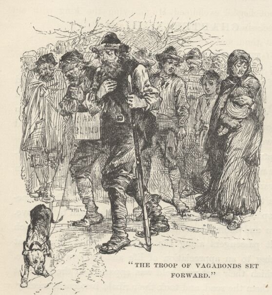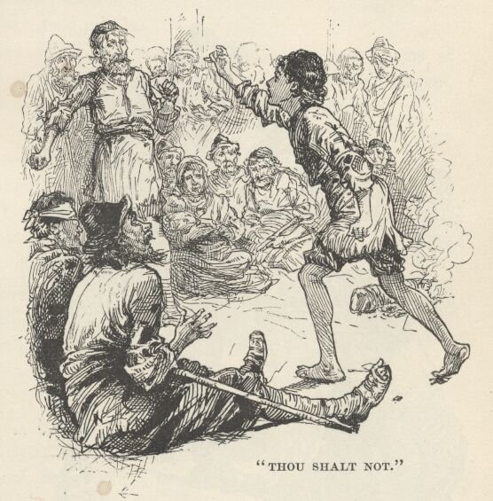 ベットとナンは十五歳の双子だった。心根は優しい娘たちだったが、不潔で、ぼろをまとい、ひどく無知だった。母親も彼女たちと同じような人間だった。しかし、父親と祖母は二人揃って悪鬼のような人間だった。機会さえあれば酒に酔い、酔えば互いに、あるいは邪魔する者なら誰彼かまわず殴り合った。酔っていてもいなくても、常に罵り、悪態をついた。ジョン・キャンティは泥棒で、その母親は物乞いであった。二人は子供たちを物乞いに仕立て上げたが、泥棒にすることには失敗した。その家に住む恐ろしいならず者たちの中に、しかし彼らとは一線を画して、善良な老神父がいた。彼は王によって家を追われ、ほんのわずかな年金で暮らしていたが、子供たちを脇へ呼び、人目を忍んで正しい道を教えていた。アンドリュー神父はまた、トムに少しばかりのラテン語と、読み書きを教えた。姉たちにも同じように教えようとしたが、彼女たちは友人の嘲笑を恐れた。友人たちは、姉妹がそんな奇妙な教養を身につけることなど我慢できなかっただろう。