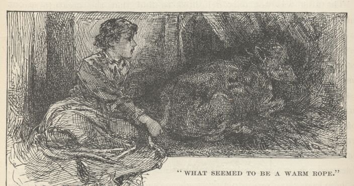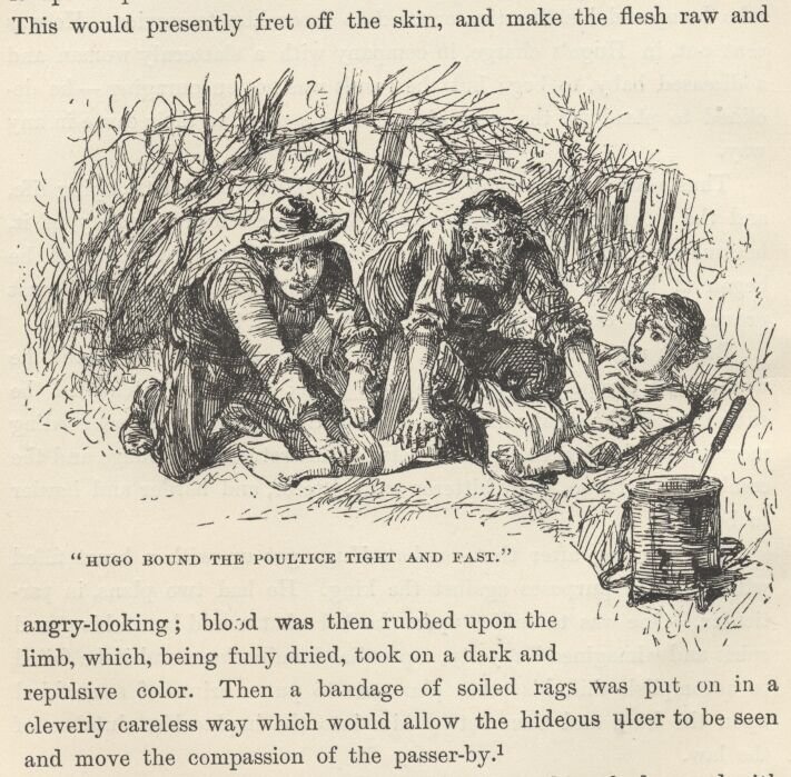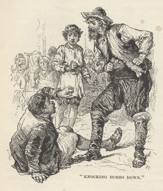 臓物横丁全体が、キャンティの家と同じような巣窟だった。酔っぱらい、暴動、喧嘩が毎晩、それもほとんど夜通し繰り広げられるのが常であった。その場所では、頭を割られることは飢えと同じくらい日常茶飯事だった。それでも、幼いトムは不幸ではなかった。彼は辛い目に遭っていたが、それを知らなかった。それは臓物横丁の少年たち誰もが送る暮らしであり、したがって彼はそれが当たり前で、快適なものだと思っていた。夜、手ぶらで家に帰れば、まず父親に罵られ、鞭打たれることを彼は知っていた。父親が終われば、今度は恐ろしい祖母が同じことを繰り返し、さらに輪をかけて打ちのめすだろう。そして夜更けになると、飢えた母親が、自分は腹を空かせて息子のためにとっておいた哀れな食べ残しやパンの耳を、こっそりと彼の元へ滑り込ませてくれるのだった。母親はそのような裏切り行為をしばしば夫に見つかり、ひどく殴られていたにもかかわらず。