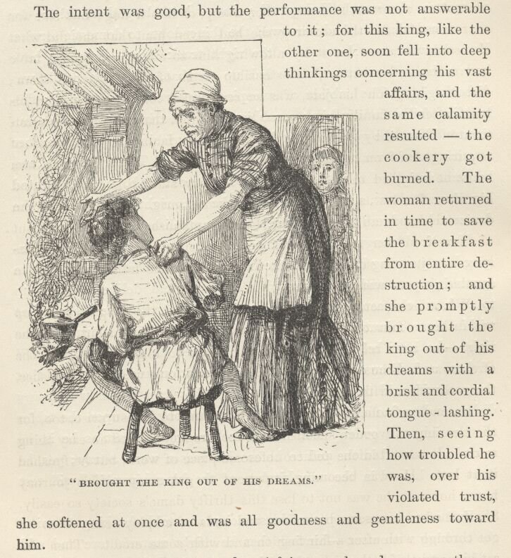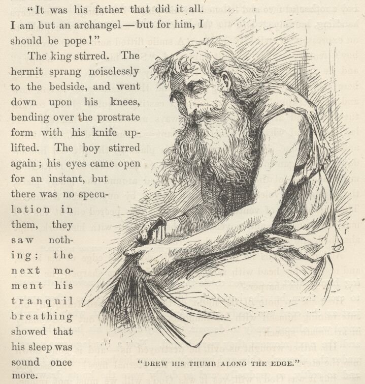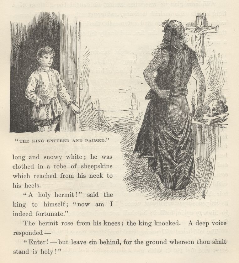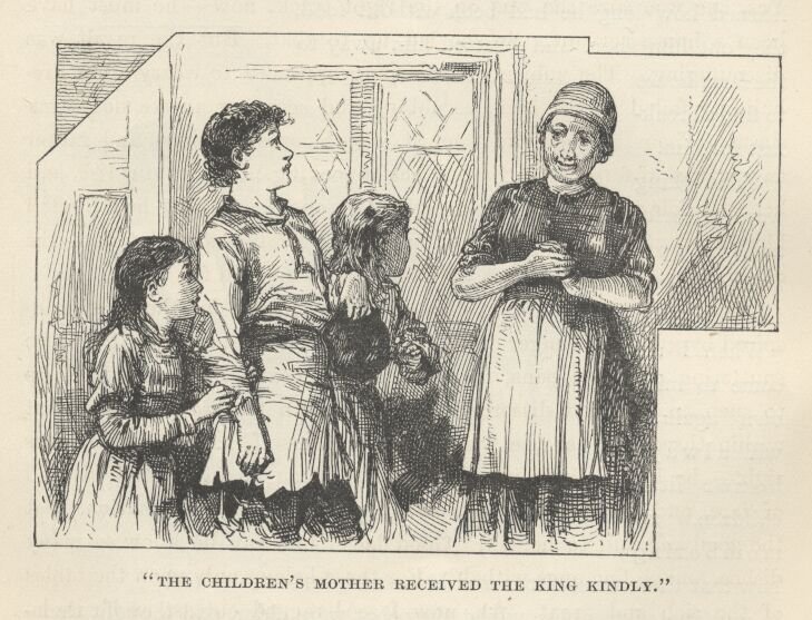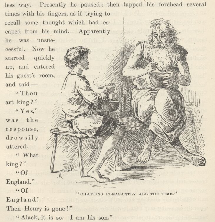 王は生きている限り、その冒険譚を語るのが好きだった。歩哨に宮殿の門から殴りつけられて追い払われた時から、最後の真夜中、急ぎ働く職人たちの群れに巧みに紛れ込み、そうして寺院に忍び込み、告解王の墓に登って隠れ、翌日あまりに長く眠りすぎたために、戴冠式をすんでのところで見逃すところだった話まで、すべてを語った。彼は、その貴重な教訓を頻繁に繰り返すことが、その教えを民の利益となるようにするという目的を強く保つ助けになると言った。そして、命ある限り、その物語を語り続け、それによってその悲痛な光景を記憶に新しく留め、その心にある憐れみの泉が枯れぬようにするのだ、と。