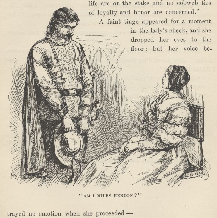 すべての謎が解き明かされたとき、ヒュー・ヘンドンの告白によって、ヘンドン・ホールでのあの日、妻がマイルズを否認したのは彼の命令によるものであったことが明らかになった。その命令は、もし彼女がマイルズ・ヘンドンであることを否定せず、その立場を固守しないならば、彼女の命を奪うという、極めて信頼に足る約束によって後押しされていた。すると彼女は「どうぞ!」と言った――命など惜しくはない、マイルズを否認するつもりはない、と。そこで夫は、彼女の命は助けるが、マイルズを暗殺させると言った! これは話が別だった。そこで彼女は約束し、それを守ったのである。