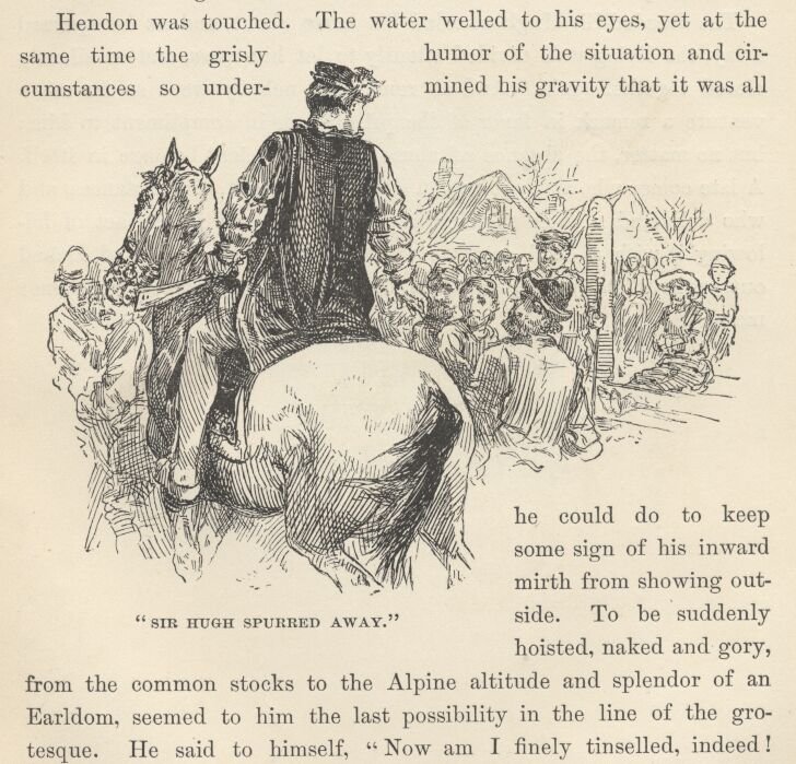 二人は人でごった返す中庭を横切り、宮殿の壮麗な玄関に到着した。そこで士官は再びお辞儀をすると、ヘンドンを豪奢な役人に引き渡した。役人は彼を深々と敬意を払って迎え、両側に豪華な制服の従僕たちの列が並ぶ大広間を通り抜け(従僕たちは二人が通り過ぎる際に敬虔なお辞儀をしたが、我らが威風堂々たる案山子の後ろ姿が見えなくなると同時に、声なき笑いの発作に襲われた)、立派な身なりの人々の群れの中を広い階段を上り、ついに広大な部屋へと彼を案内した。そして、居並ぶイングランド貴族たちの間を切り開くように道を作り、お辞儀を一つすると、帽子を取るよう促し、彼を部屋の中央に立たせたまま去っていった。彼はすべての視線の的となり、多くの憤慨した顰め面と、十分なほどの面白がるような、そして嘲るような微笑みに晒された。
