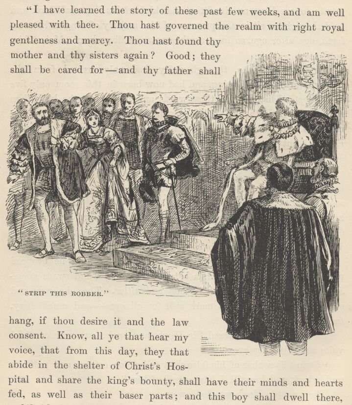 「この数週間の物語は聞いた。そなたの働きに満足している。そなたは真に王たる優しさと慈悲をもってこの王国を治めた。母と姉妹たちには再会できたか? よろしい。彼女らは保護されるであろう――そして、そなたの父は、そなたが望み、法が許すならば、絞首刑に処そう。我が声を聞く者すべてに知らしめる。今日より、クライスト・ホスピタルの庇護のもとに暮らし、王の恩恵にあずかる者たちは、その卑しき肉体だけでなく、その精神と心もまた養われるであろう。そしてこの少年はそこに住み、その名誉ある理事会において、生涯、首席の地位を占めるものとする。また、彼がかつて王であったことに鑑み、通常の敬意以上のものが払われるのがふさわしい。ゆえに、この彼の礼服に注目せよ。これによって彼は知られ、何人もこれを模倣してはならぬ。彼がどこへ行こうとも、人々は彼がその時代に王であったことを思い起こし、彼にふさわしい敬意を拒んだり、挨拶を怠ったりしてはならぬ。彼は玉座の保護を受け、王冠の支持を得る。彼は『王の被後見人』という名誉ある称号によって知られ、呼ばれるであろう。」