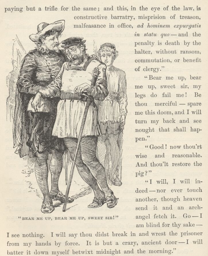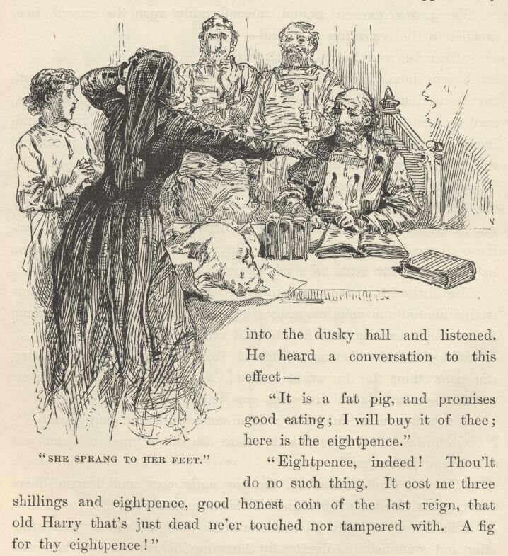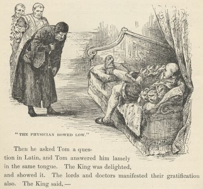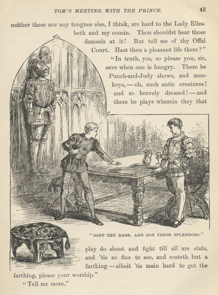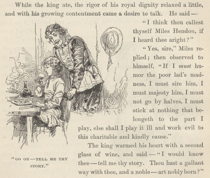 「学ぶがよい、少年よ。難しいのは最初だけだ。ギリシャ語はもっと難しい。しかし、これらも他のどの言語も、エリザベス王女や我が従姉妹にとっては難しくはないと思う。あの娘たちの語学を聞かせてやりたいものだ! だが、そなたの臓物横丁について話してくれ。そこでの生活は楽しいか?」