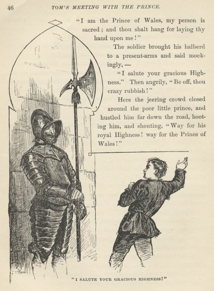 「ならば我が言おう。そなたは我と同じ髪、同じ目、同じ声と物腰、同じ体格と背丈、同じ顔と表情をしている。我らが裸で出歩いたとて、どちらがそなたで、どちらがプリンス・オブ・ウェールズか、誰にも見分けはつくまい。そして、今やそなたが着ていた服を我は着ている。これで、あの無骨な兵士が――聞け、これはそなたの手のあざではないか?」
