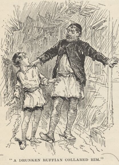 臓物横丁全体が、キャンティの家と同じような巣窟だった。酔っぱらい、暴動、喧嘩が毎晩、それもほとんど夜通し繰り広げられるのが常であった。その場所では、頭を割られることは飢えと同じくらい日常茶飯事だった。それでも、幼いトムは不幸ではなかった。彼は辛い目に遭っていたが、それを知らなかった。それは臓物横丁の少年たち誰もが送る暮らしであり、したがって彼はそれが当たり前で、快適なものだと思っていた。夜、手ぶらで家に帰れば、まず父親に罵られ、鞭打たれることを彼は知っていた。父親が終われば、今度は恐ろしい祖母が同じことを繰り返し、さらに輪をかけて打ちのめすだろう。そして夜更けになると、飢えた母親が、自分は腹を空かせて息子のためにとっておいた哀れな食べ残しやパンの耳を、こっそりと彼の元へ滑り込ませてくれるのだった。母親はそのような裏切り行為をしばしば夫に見つかり、ひどく殴られていたにもかかわらず。