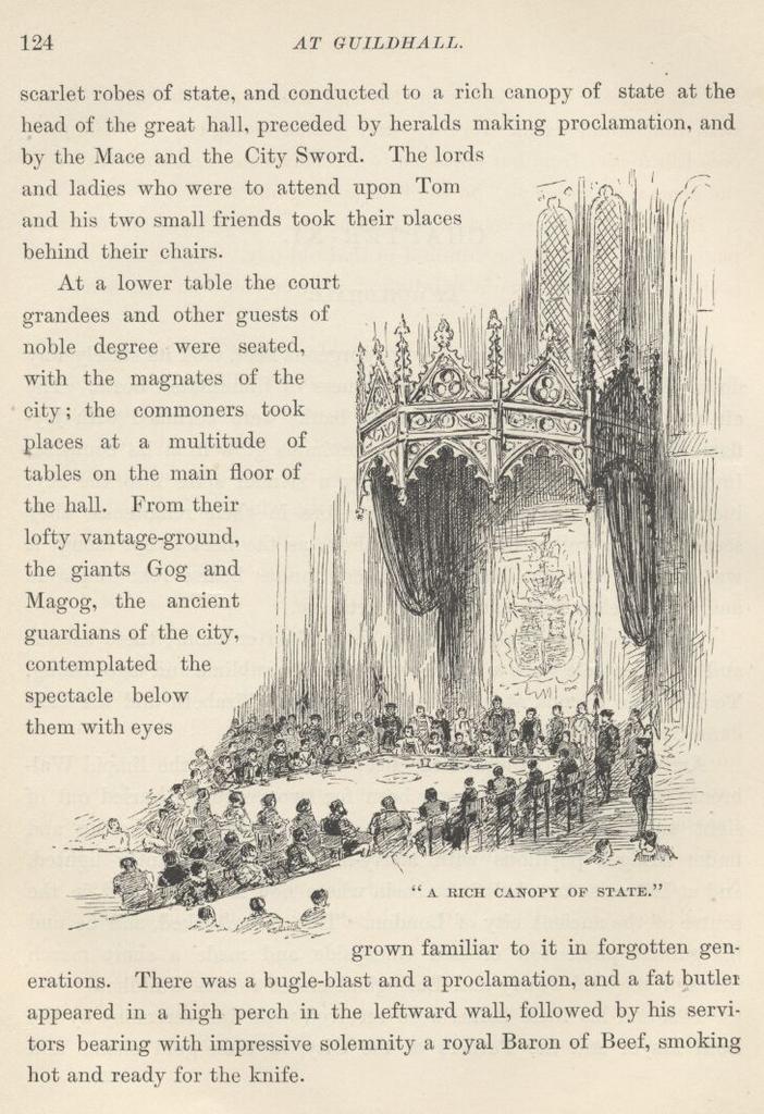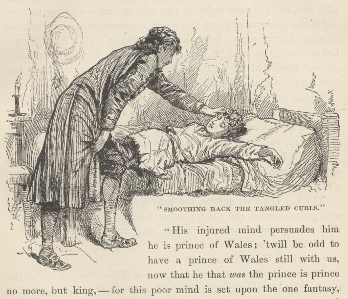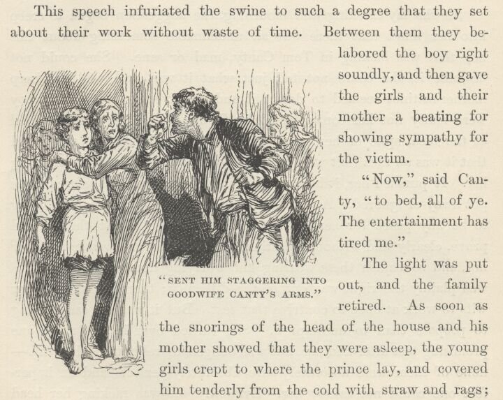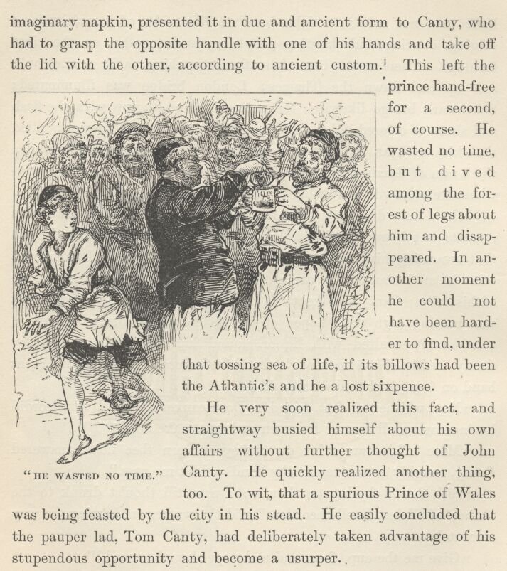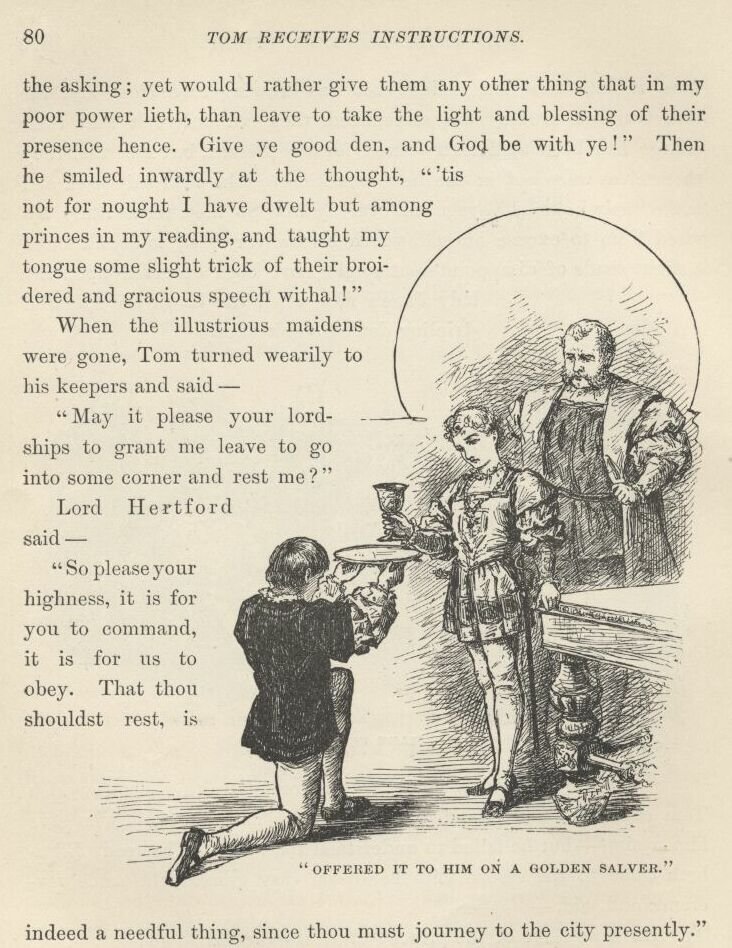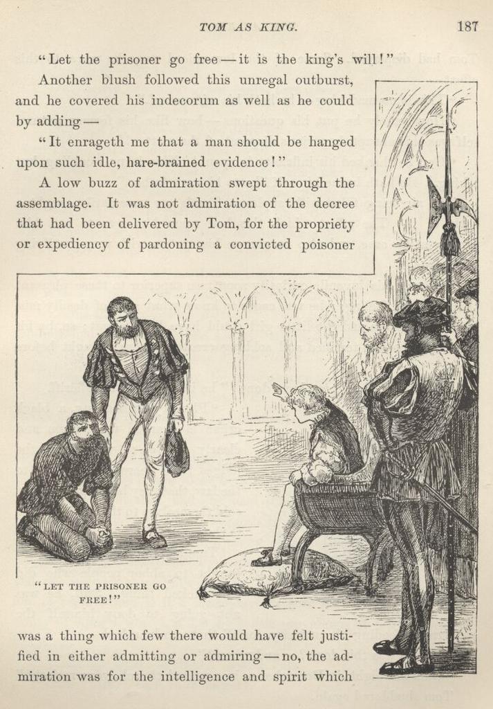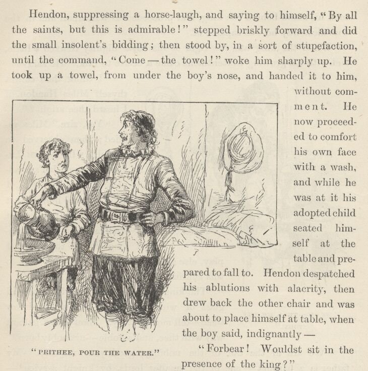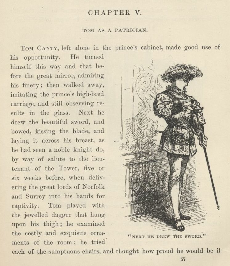 やがて、トムの読書と王子のような生活への夢想は、彼に強い影響を及ぼし、彼は無意識のうちに王子のように 振る舞う ようになった。彼の話し方や物腰は、奇妙なほど儀式ばり、宮廷風になり、親しい仲間たちを大いに感心させ、楽しませた。しかし、トムの仲間内での影響力は日増しに大きくなり、やがて彼は、一種の驚きと畏敬の念をもって、優れた存在として仰ぎ見られるようになった。彼はなんと物知りなのだろう! なんと素晴らしいことをし、言うのだろう! そして何よりも、なんと思慮深く賢いのだろう! トムの言葉や振る舞いは、少年たちによって彼らの年長者に報告された。そして、年長者たちもまた、やがてトム・キャンティについて語り始め、彼を非常に才能のある非凡な存在と見なすようになった。大人たちまでもが、自分たちの悩みをトムに持ち込んで解決を求め、彼の判断の機知と賢明さにしばしば驚かされた。事実、彼は自分の家族を除いて、彼を知るすべての人々にとって英雄となっていた――ただ家族だけが、彼の中に何も見出さなかった。