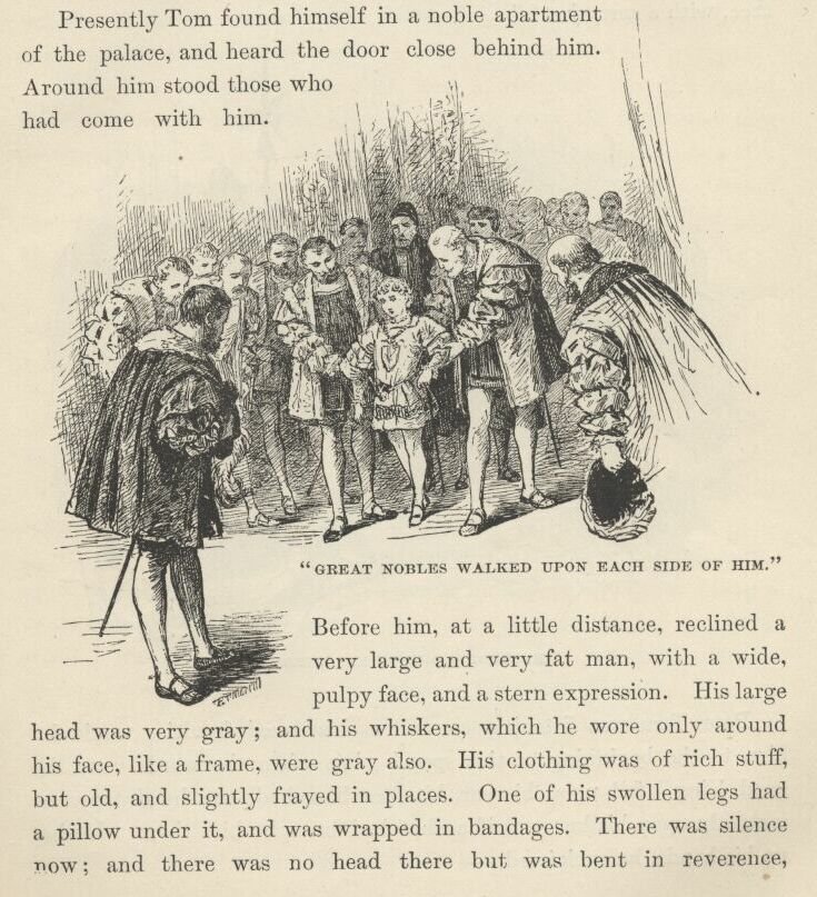 いや、トムの生活は、特に夏の間は、まずまず順調だった。物乞いに対する法律は厳しく、罰則も重かったため、彼はただ罰を免れる程度にしか物乞いをしなかった。だから、時間の多くは、善良なアンドリュー神父が語ってくれる、巨人や妖精、小人や精霊、魔法の城、そして豪華絢爛な王や王子たちの魅力的な古い物語や伝説に耳を傾けて過ごした。彼の頭はこうした素晴らしい物語でいっぱいになった。鞭打たれて痛み、疲れ、腹を空かせ、乏しく悪臭を放つ藁の上に暗闇で横たわる多くの夜、彼は想像力の翼を広げ、王宮で寵愛される王子の魔法のような生活を心に甘美に描き出すうちに、すぐに痛みや苦しみを忘れた。やがて一つの願望が昼も夜も彼を悩ませるようになった。それは、本物の王子を、この目で一度見てみたいというものだった。一度、臓物横丁の仲間たちにそのことを話してみたが、彼らは無慈悲なまでに彼を嘲り、馬鹿にしたので、それ以降、彼はその夢を胸の内に秘めておくことにした。