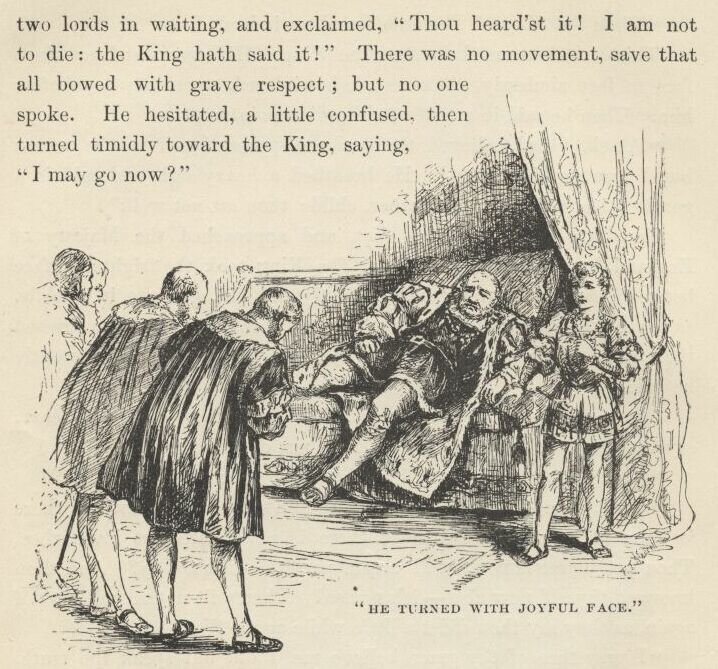 「この数週間の物語は聞いた。そなたの働きに満足している。そなたは真に王たる優しさと慈悲をもってこの王国を治めた。母と姉妹たちには再会できたか? よろしい。彼女らは保護されるであろう――そして、そなたの父は、そなたが望み、法が許すならば、絞首刑に処そう。我が声を聞く者すべてに知らしめる。今日より、クライスト・ホスピタルの庇護のもとに暮らし、王の恩恵にあずかる者たちは、その卑しき肉体だけでなく、その精神と心もまた養われるであろう。そしてこの少年はそこに住み、その名誉ある理事会において、生涯、首席の地位を占めるものとする。また、彼がかつて王であったことに鑑み、通常の敬意以上のものが払われるのがふさわしい。ゆえに、この彼の礼服に注目せよ。これによって彼は知られ、何人もこれを模倣してはならぬ。彼がどこへ行こうとも、人々は彼がその時代に王であったことを思い起こし、彼にふさわしい敬意を拒んだり、挨拶を怠ったりしてはならぬ。彼は玉座の保護を受け、王冠の支持を得る。彼は『王の被後見人』という名誉ある称号によって知られ、呼ばれるであろう。」