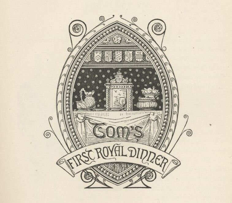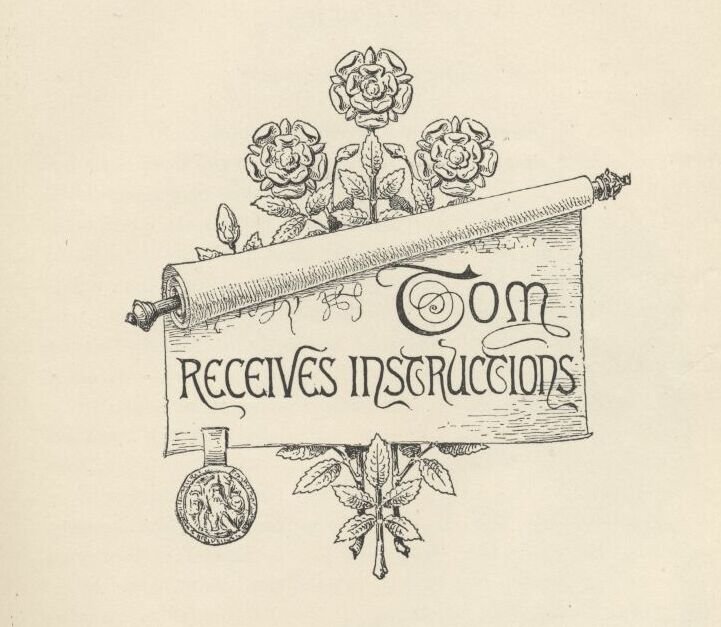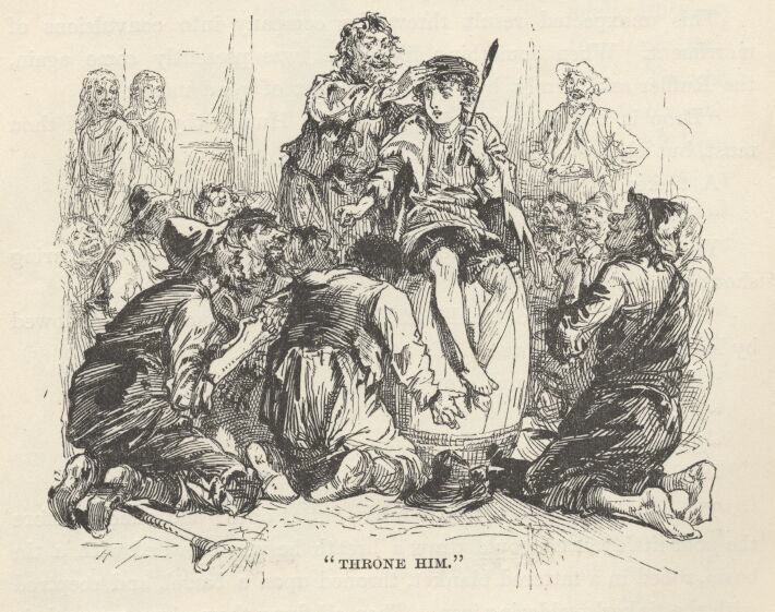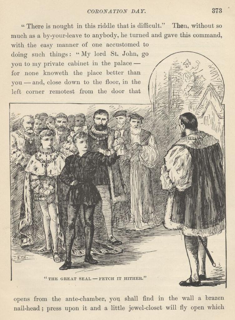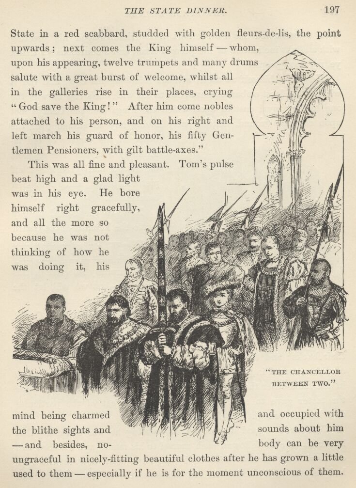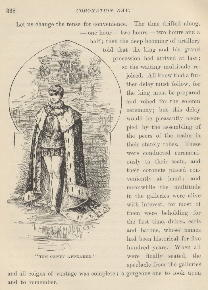 しばらくして、トムは内密に宮廷ごっこを組織した! 彼が王子であり、彼の特別な仲間たちは護衛、侍従、馬丁、侍従の貴族や貴婦人、そして王室の一員となった。毎日、偽りの王子は、トムがロマンチックな物語から借用した手の込んだ儀式で迎えられた。毎日、模擬王国の重大な国事が王室会議で議論され、毎日、偽りの王子殿下は、彼の想像上の陸軍、海軍、そして副王領に布告を発した。