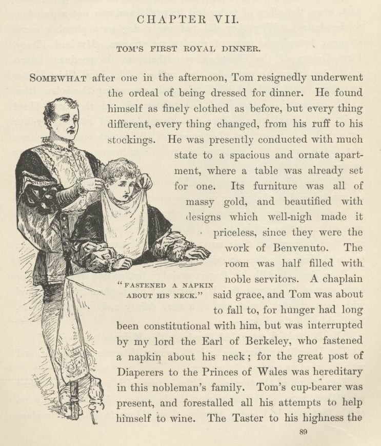 六人ほどの従者が前に飛び出した――何をするためか、私にはわからない。おそらくは邪魔をするためだったのだろう。しかし、彼らは実に王らしい身振りで退けられ、まるで彫像のようにその場にぴたりと立ち尽くした。エドワードはトムを宮殿内の豪華な一室、彼が書斎と呼ぶ部屋へ連れて行った。彼の命令で、トムが書物の中でしか見たことのないような食事が運ばれてきた。王子は、王族らしい繊細さと育ちの良さから、彼の卑しい客が従者たちの批判的な視線に当惑しないようにと、従者たちを下がらせた。それから、彼は近くに座り、トムが食事をする間、質問をした。