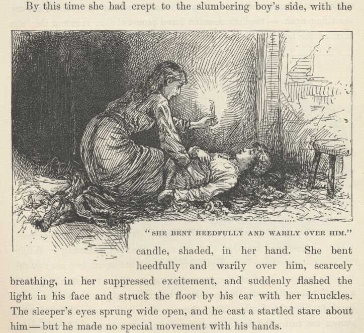 ベットとナンは十五歳の双子だった。心根は優しい娘たちだったが、不潔で、ぼろをまとい、ひどく無知だった。母親も彼女たちと同じような人間だった。しかし、父親と祖母は二人揃って悪鬼のような人間だった。機会さえあれば酒に酔い、酔えば互いに、あるいは邪魔する者なら誰彼かまわず殴り合った。酔っていてもいなくても、常に罵り、悪態をついた。ジョン・キャンティは泥棒で、その母親は物乞いであった。二人は子供たちを物乞いに仕立て上げたが、泥棒にすることには失敗した。その家に住む恐ろしいならず者たちの中に、しかし彼らとは一線を画して、善良な老神父がいた。彼は王によって家を追われ、ほんのわずかな年金で暮らしていたが、子供たちを脇へ呼び、人目を忍んで正しい道を教えていた。アンドリュー神父はまた、トムに少しばかりのラテン語と、読み書きを教えた。姉たちにも同じように教えようとしたが、彼女たちは友人の嘲笑を恐れた。友人たちは、姉妹がそんな奇妙な教養を身につけることなど我慢できなかっただろう。